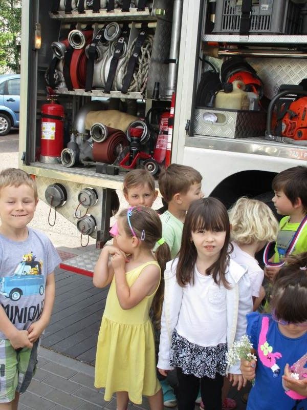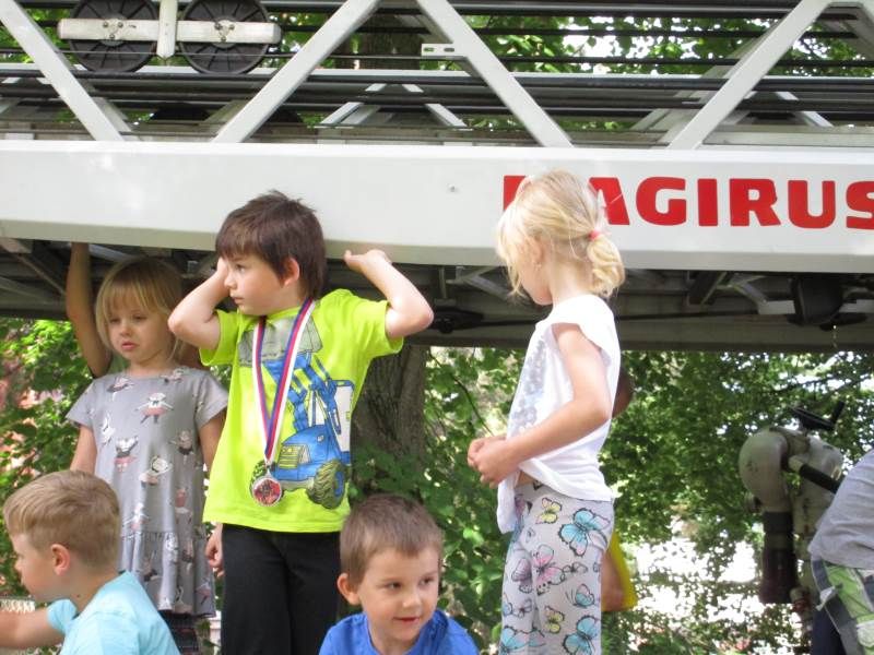 … utíkejte do bezpečí, klakson troubí fanfáru, hasič spěchá k požáru aneb TAKTICKÉ CVIČENÍ Hasičského záchranného sboru Pardubického kraje. Cílem cvičení bylo praktické procvičení možnosti nasazení a taktickou připravenost jednotky HZS PS Chrudim při požárním zásahu v MŠ. Procvičení spolupráce s dobrovolnými hasiči Chrudim a spolupráci MŠ při evakuaci dětí u mimořádné události. V 8,56 hodin se v naší mateřské škole ozval hlas HOŘÍ. Co se dělo dál? Paní ředitelka volala na tísňové volání 150 a ohlásila požár kuchyňky. Mezitím už všichni dospělí zaměstnanci vyváděli naše děti do bezpečí školní zahrady. V davu dětí se ozýval hlas Tobíka: Hlavně žádnou paniku. V 9, 02 hodin už před školkou zastavovala postupně čtyři hasičská auta a vše začalo. Hasiči předvedli bleskový a účinný zásah a záchranu pohřešovaných dětí, kterým byly po nalezení nasazeny vyváděcí masky. Po dětech byla zachráněna i paní učitelka, kterou museli evakuovat na nosítkách a byla ji poskytnuta první předlékařská pomoc. Nakonec museli zachraňovat i hasiče, který se ztratil v objektu a docházel mu kyslík. Přestože cvičení bylo jen „JAKO“, celý zásah byl opravdu autentický. A co děti? Měly na hasiče spoustu zajímavých dotazů. Například jak se hasí mrakodrap. Vyzkoušely si, jak se sedí v hasičském autě, prohlédly si výstroj a výzbroj auta, vyšplhaly po žebříku na plošinu auta a vyzkoušely si, jak a kde sedí strojník při ovládání výsuvného žebříku. Celé pondělní dopoledne 14. května 2018 bylo nejen slunečné, ale i poučné a zábavné.