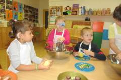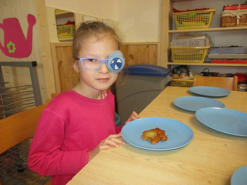 …že ji sníme, uvaříme, rozkrojíme, osolíme, omastíme a břicho si nasytíme. A měla pravdu. Děti na Korálkách se staly zahradníky, kteří si o ovoci a zelenině povídaly, zpívaly, malovaly, tiskaly, vážily a ochutnávaly, kutálely, poslouchaly pohádky. Jednu si i zahrály. O veliké řepě, kterou nakonec vytáhly. Brambory, které si děti přinesly, omyly, škrabkou oloupaly a na struhadle nastrouhaly. Ještě česnek, sůl, majoránka, vajíčko a trochu mouky. Řeknu vám, bramboráky voněly až na chodbě, a hlavně všem chutnali.