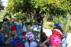 Ve středu 20. září 2023 se naše okolí mateřské školy proměnilo v prostor s dopravní tématikou. Od rána se naše školní zahrada plnila dětskými dopravními prostředky. Koly, koloběžkami, odrážedly…stromy se staly parkovacími domy. Kola menší, větší, modrá, červená, zelená růžová, bílá. Samozřejmě nesměly chybět helmy. V 9 hodin se to už na zahradě hemžilo malými cyklisty, kteří měli spousta práce, aby prošli všechna stanoviště. Někde si děti procvičily názvy dopravních značek, jinde musely prokázat zručnost při slalomu s naloženým kolečkem, se členem BESIPU si zopakovaly, co nesmí chybět na kole. S příslušníky Městské policie si děti prohlédly a vyzkoušely, jak se sedí v policejním autě, dozvěděly se, co všechno Městská policie dělá. Se studentkami Zdravotní školy se učily obvazovat pohmožděné části těla. Podle obrázků si vyprávěly, co se může, a co se nemůže nebo nesmí. V autě být připásaný pásem, nehrát si na ulici a přechodu pro chodce, používat reflexní prvky, nestrkat nic do elektrických zásuvek…bylo toho dost. A věřte, děti spousta věcí věděly, a neznámá pro ně nebyla ani důležitá telefonní čísla: 150, 155, 158. Na prázdném parkovišti před školkou naši malí cyklisti předváděli bezpečnou jízdu. K žádné nehodě nedošlo a cyklisté byli pochváleni a odměněni.
