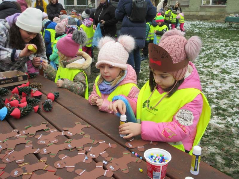 Ve čtvrtek 30. listopadu 2023 se vydali všichni předškoláci do ZŠ Bohemia na tradiční vánoční jarmark, který škola pravidelně pořádá již několik let. Do ráno trochu nasněžilo a sníh nám připomněl pomalu začínající advent. Co předškoláky na zahradě školy čekalo? Tvořivé dílničky plné vánočních výrobků, které si děti s nadšením vyráběly. Zpátky do mateřské školy si odnášely anděla na špejli, anděla z kelímku, vánoční přáníčko, perníkového kluka, šiškového skřítka, čelenku, zátkového sněhuláčka…Na posilněnou ještě děti dostaly vánoční palačinku, která všem moc chutnala a zapily ji teplým dětským punčem. Dopoledne si předškoláci užili a cestou zpátky se už těšili na svíčkovou, kterou pro ně uvařili paní kuchařky s panem kuchařem.