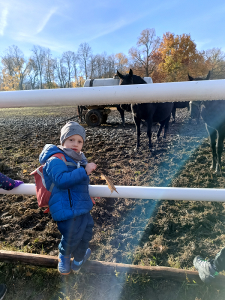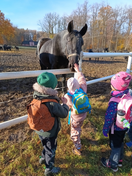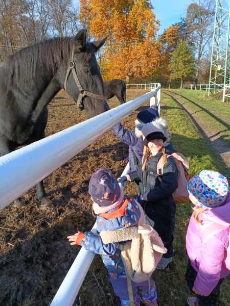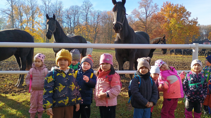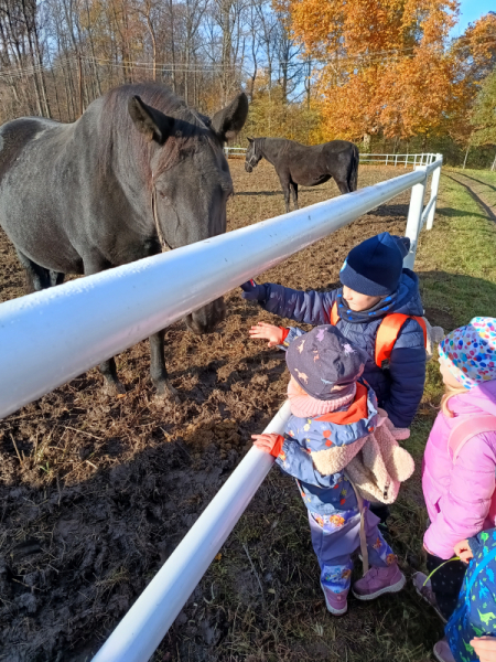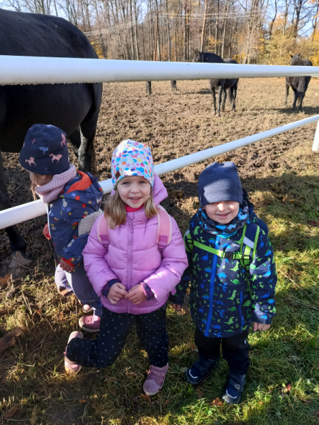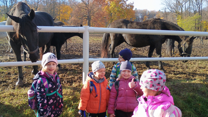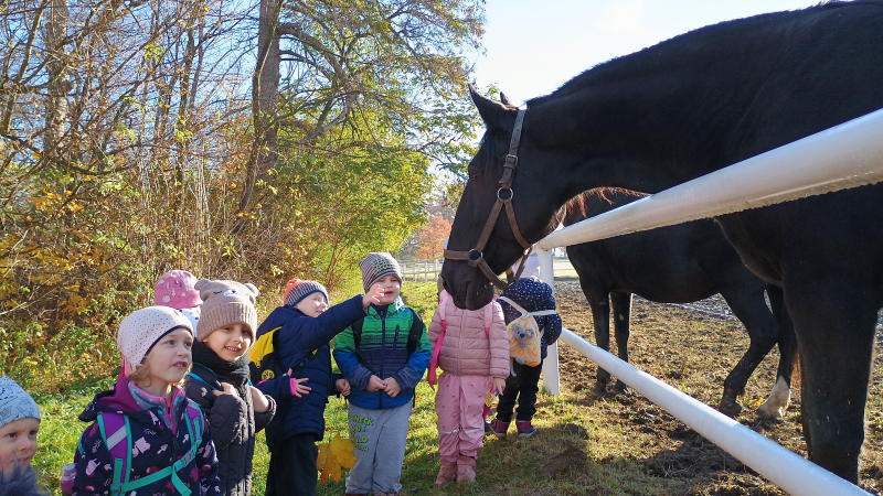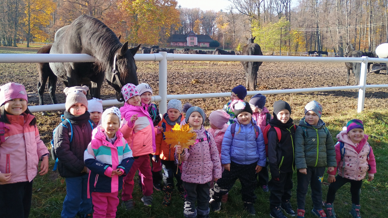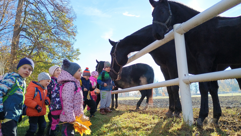 Ve středu 5. listopadu 2025 se od rána usmívalo sluníčko a slibovalo krásný den plný podzimních barev. Děti ze třídy Srdíček a Sluníček se těšily na výlet za koníčky do Slatiňan. Všichni byli nedočkaví, zda mezi nádhernými vraníky bude bílý kůň svatého Martina. Najednou byl slyšet klapot podkov a podkoviček. Co to? Kdo se k nám blíží? Po cestě si klusali ze stájí na pastvu koníci. V parku se děti posilnily vydatnou svačinou a hned měly sílu vyšlápnout si k ohradám s koňmi. A co myslíte? Jste zvědaví, jestli spatřili bílého koně? Děti měly opravdu velké štěstí a bílého koně svatého Martina viděly pobíhat s ostatními koníky v ohradě. Teď už budou jen čekat, zda na něm sv. Martin přijede do našeho města a pocukruje ho bílou peřinou.